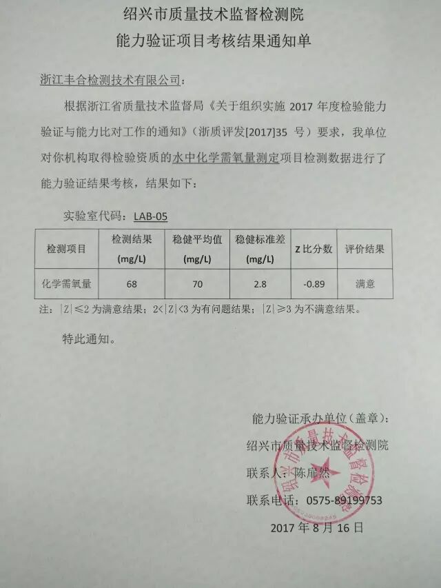 2017年8月16日,绍兴市质量技术监督检测院发放了对浙江丰合检测技术股份有限公司进行的能力验证项目考核结果通知单,考核结果为满意!