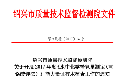 2017年6月13日,绍兴市质量技术监督检测院专家组受浙江省质量技术监督局委托对浙江丰合检测技术有限公司开展“水中化学需氧量测定”项目的能力验证和技术核查工作。