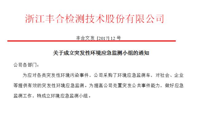 浙江丰合检测技术股份有限公司作为一家从事环境检测与产品检测的综合性检测机构,今年采购了环境应急监测车,成立了专业的应急监测小组,建立了完善健全的应急监测响应制度,成为我市第一个拥有环境应急监测车的第三方检测机构,对各类突发性环境污染进行应急检测工作。